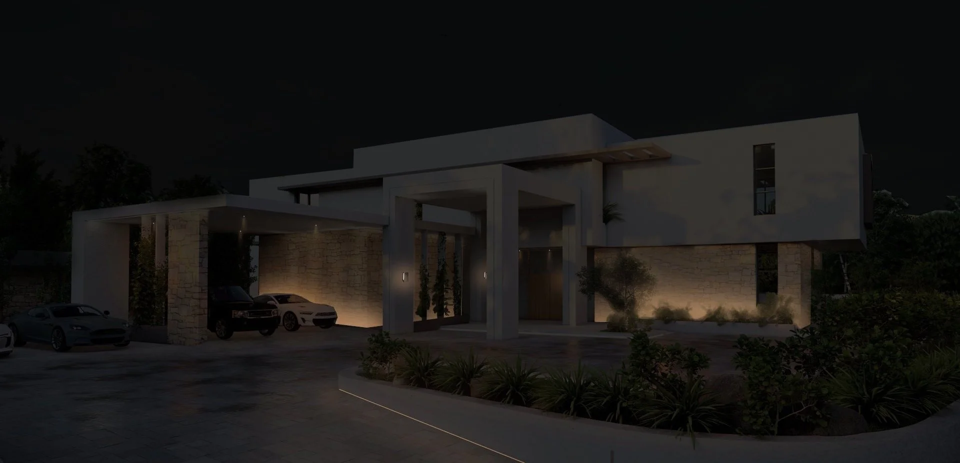Soft linear lights wash the beautiful stone facade, highlighting its elegance. In the pool, strategically placed linear lights emphasize the varied shapes, creating a mesmerizing effect.